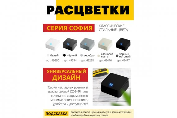 Серия накладных электроустановочных изделий София отличается современным дизайном, широкой цветовой линейкой и высоким качеством изделий. Она станет стильным элементом дизайна, как в классическом, так и современном интерьере.