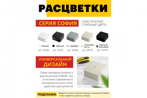 Серия накладных электроустановочных изделий София отличается современным дизайном, широкой цветовой линейкой и высоким качеством изделий. Она станет стильным элементом дизайна, как в классическом, так и современном интерьере.