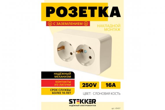 Розетка STEKKER MST16-12-04 на 2 гнездо, с заземлением. Материал: ABS пластик, цвет слоновая кость, размер 124*60*40мм. Номинальное напряжение 230, номинальный ток 16А, диапазон рабочих температур 0..+35°C, IP20