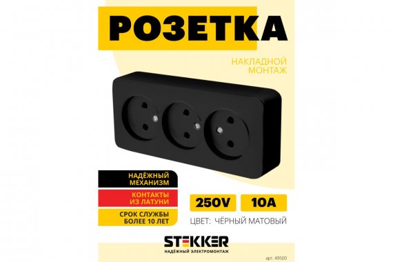 Розетка STEKKER MST10-13-05 на 3 гнездо, без заземления. Материал: ABS пластик, цвет черный матовый, размер 160*60*30мм. Номинальное напряжение 230, номинальный ток 10А, диапазон рабочих температур 0..+35°C, IP20