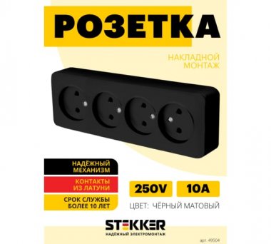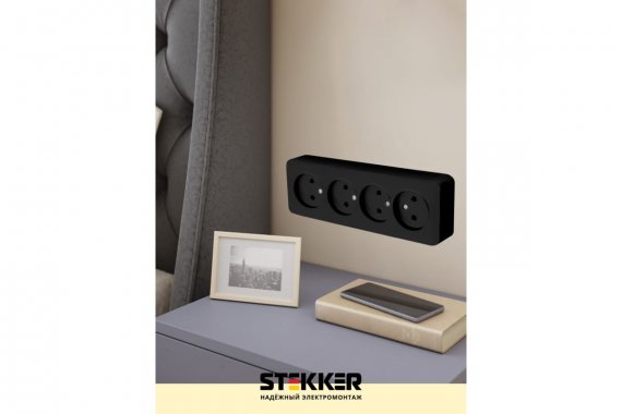 Розетка STEKKER MST10-14-05 на 4 гнездо, без заземления. Материал: ABS пластик, цвет черный матовый, размер 210*60*40мм. Номинальное напряжение 230, номинальный ток 10А, диапазон рабочих температур 0..+35°C, IP20