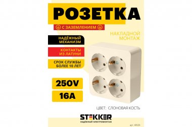 Розетка STEKKER MST16-14S-04 на 4 гнездо, с заземлением. Материал: ABS пластик, цвет слоновая кость, размер 124*124*30мм. Номинальное напряжение 230, номинальный ток 16А, диапазон рабочих температур 0..+35°C, IP20