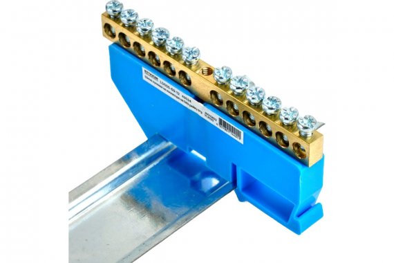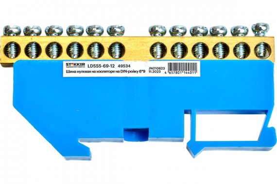 LD555-69-12 Шина "N" на изоляторе 6*9 на DIN-рейку 12 выводов, синий