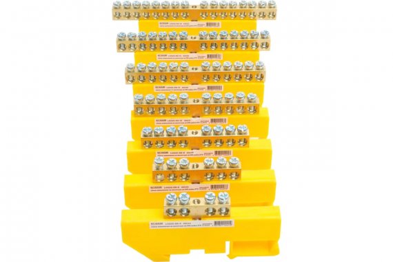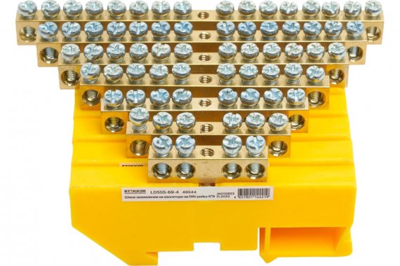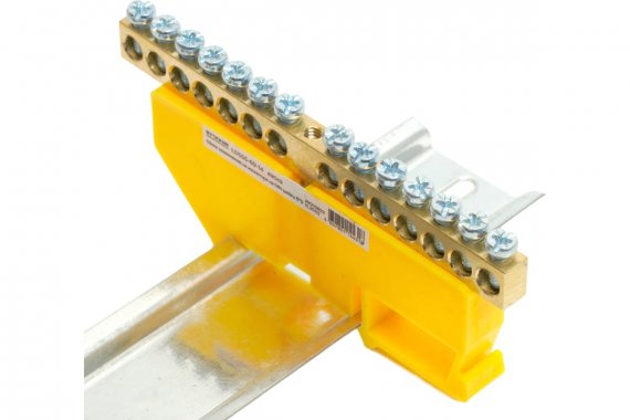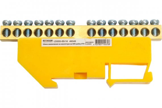LD555-69-14 Шина "PE" на изоляторе 6*9 на DIN-рейку 14 выводов, желтый