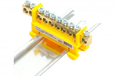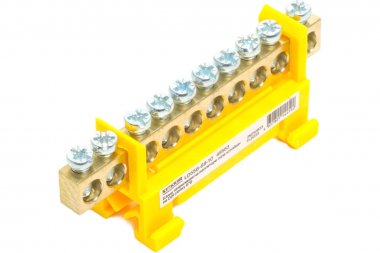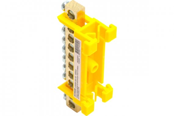 LD556-69-10 Шина "PE" на изоляторе 6*9 тип "стойка" на DIN-рейку 10 выводов, желтый