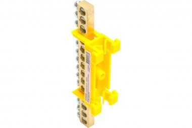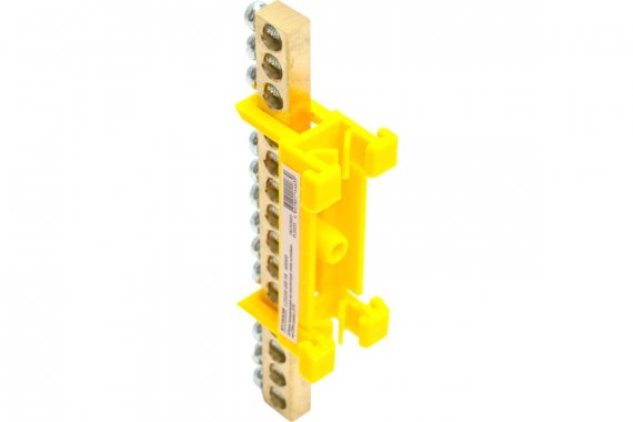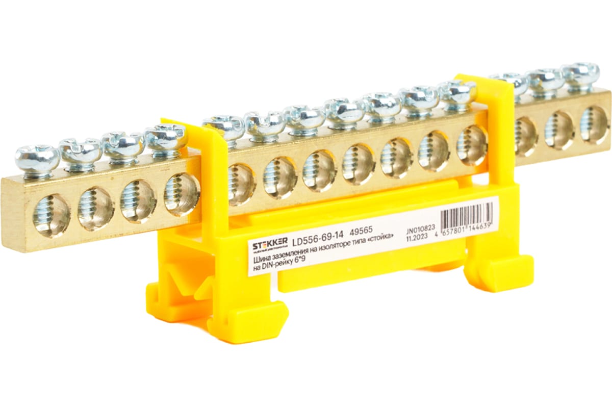LD556-69-14 Шина "PE" на изоляторе 6*9 тип "стойка" на DIN-рейку 14 выводов, желтый