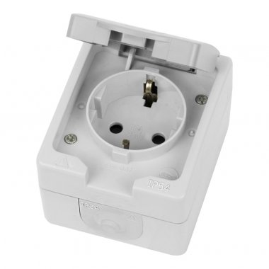 Розетка STEKKER PST16-21-54 (расстояние между монтаж отверстиями: 55*65мм) на 1 гнездо, с крышкой, с заземлением. Материал: Полипропилен, ABS пластик, латунь, цвет белый+серый, размер 63*75*50мм. Номинальное напряжение 250, номинальный ток 16А, диапазон рабочих температур 0..+35°C, IP54