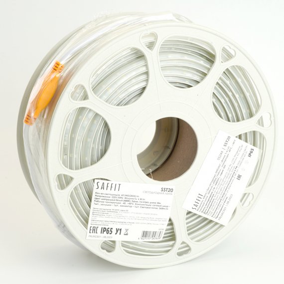 Лента светодиодная 220V SAFFIT SST20 , 60*SMD2835, 6W/m, IP65, 4000К (нейтральный белый), в комплекте сетевой шнур, Кратность резки мм 1000мм, раб.t -40°C...+40°C, бобина 50 метров*9мм*6 мм