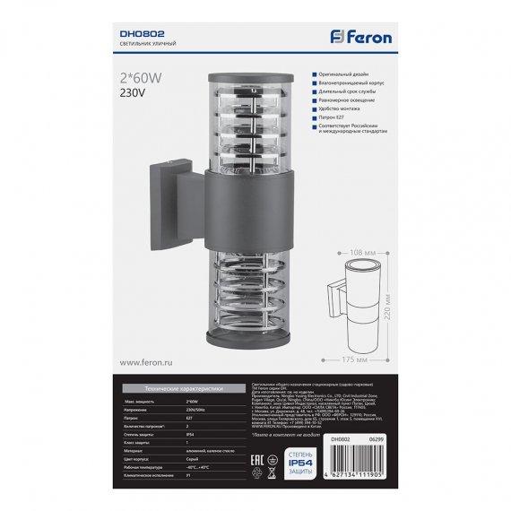 Feron 6299 Светильник садово-парковый, (НБУ) DH0802 60W, E27, 230V, IP54