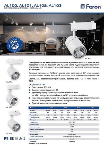 Технические характеристики Feron Светильник трековый светодиодный на шинопровод 8W, 720 Lm, 4000К, 35 градусов, белый, AL100 29508