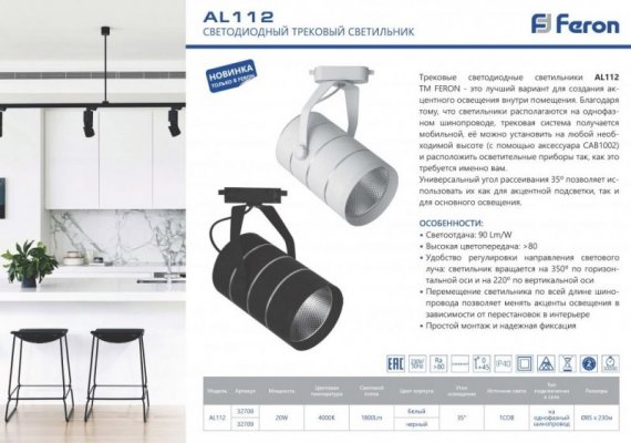 Технические характеристики Feron AL112 Светильник трековый светодиодный на шинопровод, однофазный , 20W, 4000К , 230V, 1800Lm 32708