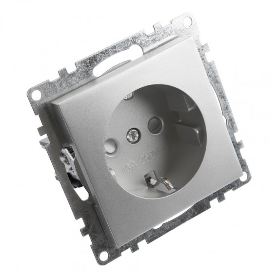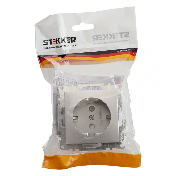 Розетка STEKKER GLS16-7110-03 на 1 гнездо, с заземлением. Материал: ABS пластик, латунь, цвет серебро, размер 55*55*35мм. Номинальное напряжение 250, номинальный ток 16А, диапазон рабочих температур 0..+35°C, IP20