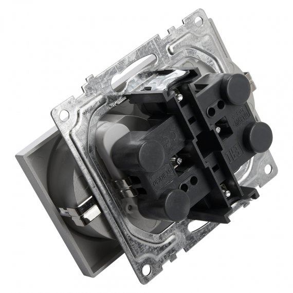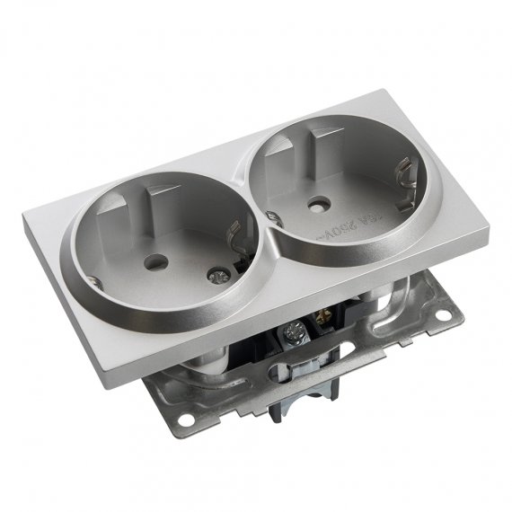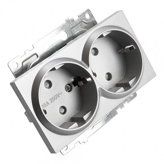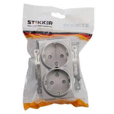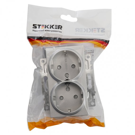 Розетка STEKKER GLS16-7114-03 на 2 гнездо, с заземлением. Материал: ABS пластик, латунь, цвет серебро, размер 90*50*45мм. Номинальное напряжение 250, номинальный ток 16А, диапазон рабочих температур 0..+35°C, IP20