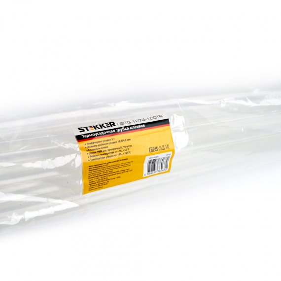 Термоусадочные трубки STEKKER HSTG-1274-100TR, длина 1000мм. 10шт. в наборе, цвет: прозрачный. Коэффициент усадки 3:1, диапазон рабочих температур -10..+35°C, температура усадки +85..+125°C, номинальный ток 32А, для проводов сечением мм2.