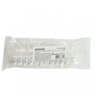 Клемма винтовая колодка STEKKER LD226-10A, 12-проводная 6- 10мм2, 450В, 10А, без пасты, материал изделия полипропилен, латунь, сталь. Тип провода одножильный/многожильный, материал провода латунь/медь, температура окружающей среды -15...+95°C