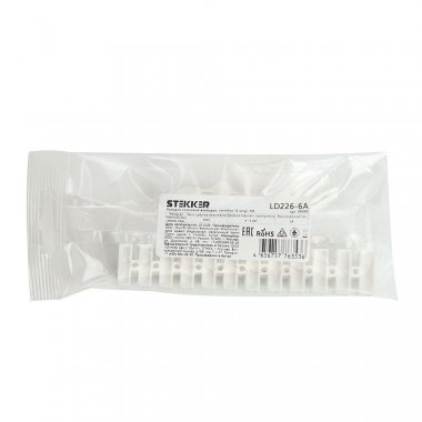 Клемма винтовая колодка STEKKER LD226-6A, 12-проводная 4 - 6 мм2, 450В, 6А, без пасты, материал изделия полипропилен, латунь, сталь. Тип провода одножильный/многожильный, материал провода латунь/медь, температура окружающей среды -15...+95°C