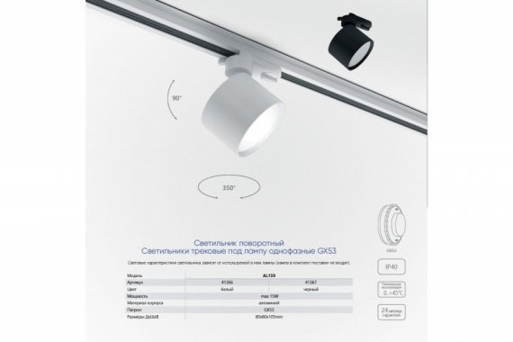 Технические характеристики Feron Светильник трековый под лампу GX53, черный, AL159 41367