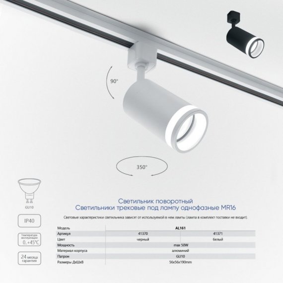 Технические характеристики Feron Светильник трековый под лампу GU10, черный, AL161 41370