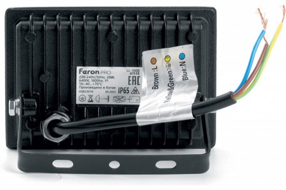 Технические характеристики Feron Прожектор светодиодный 20W 6400K IP65 AC220-240V/50Hz, черный, LL-1000 41538
