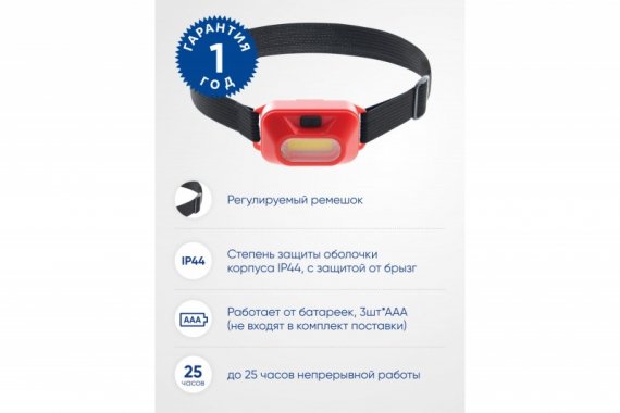 Фонарь налобный светодиодный, работающий от батареек 3*AAA, 2W, COB, IP44, пластик, TH2307