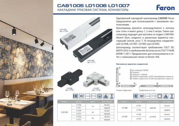 Технические характеристики Feron Шинопровод для трековых светильников, черный, 2м, в наборе токоввод, заглушка, крепление, CAB1005 41732