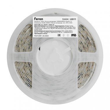 Лента светодиодная 24V FERON LS511, 120*SMD2835, 11W/m, IP65, 3000К (теплый белый), Кратность резки мм 50мм, 5000*8*1.22мм