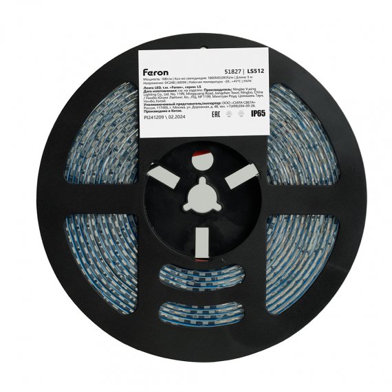 Технические характеристики Feron Лента светодиодная 24V , 180*SMD2835, 16W/m, IP65, 6000К (холодный белый), Кратность резки мм 33мм, 51827