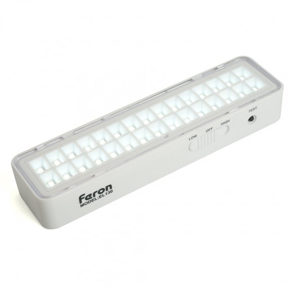 Светильник аккумуляторный FERON EL130 DC, 30LED/дневной, 100-240V, IP20, аккумулятор 3,7/500mAh/Li-Ion (литий-ионный), количество режимов 2, время зарядки 24 часа, время работы 2/4часов, цвет белый, 160*42*25мм