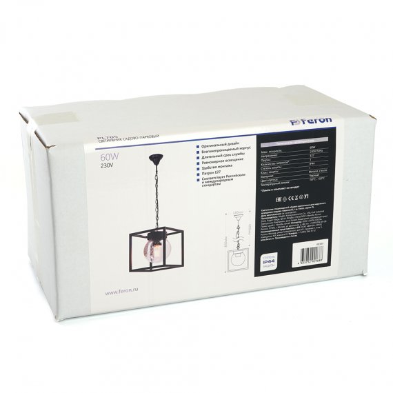 Технические характеристики Feron Светильник садово-парковый, серии «Прованс», (НСУ) 60W, E27, 230V, IP44, цвет черный, квадрат, на цепочке, 48384