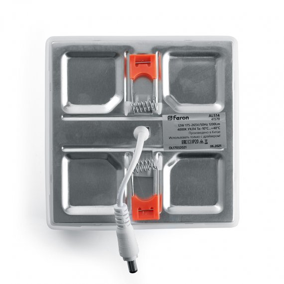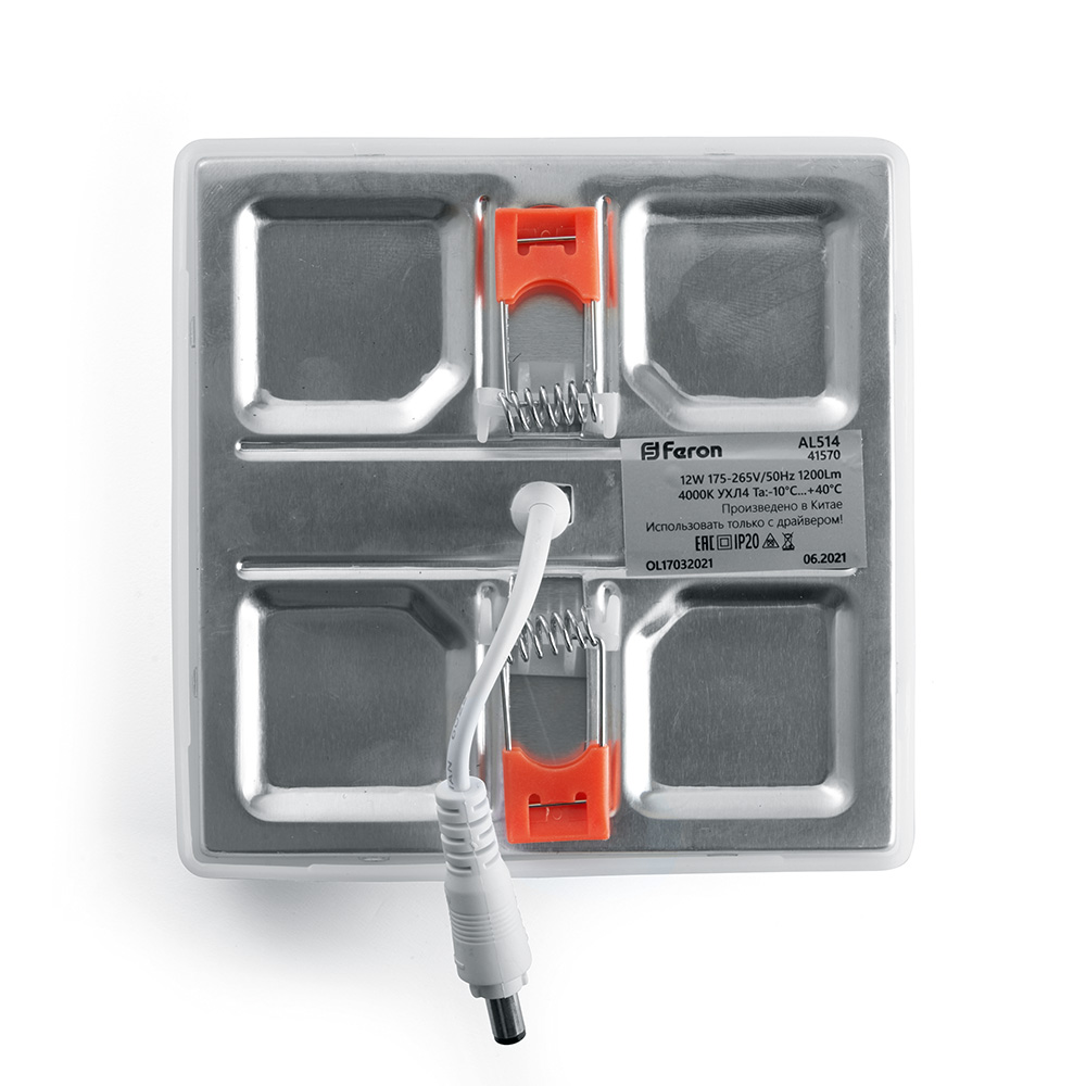 Светильники светодиодные с регулируемым монтажным диаметром, ультратонкий (ДВО) FERON AL514, 12W 4000К (белый), 175-265V, 1200Lm, IP20, угол рассеивания 120°, цвет белый, корпус алюминий, рассеиватель пластик, 120*120*20 мм, монтажн.отв. 40*40 мм.
